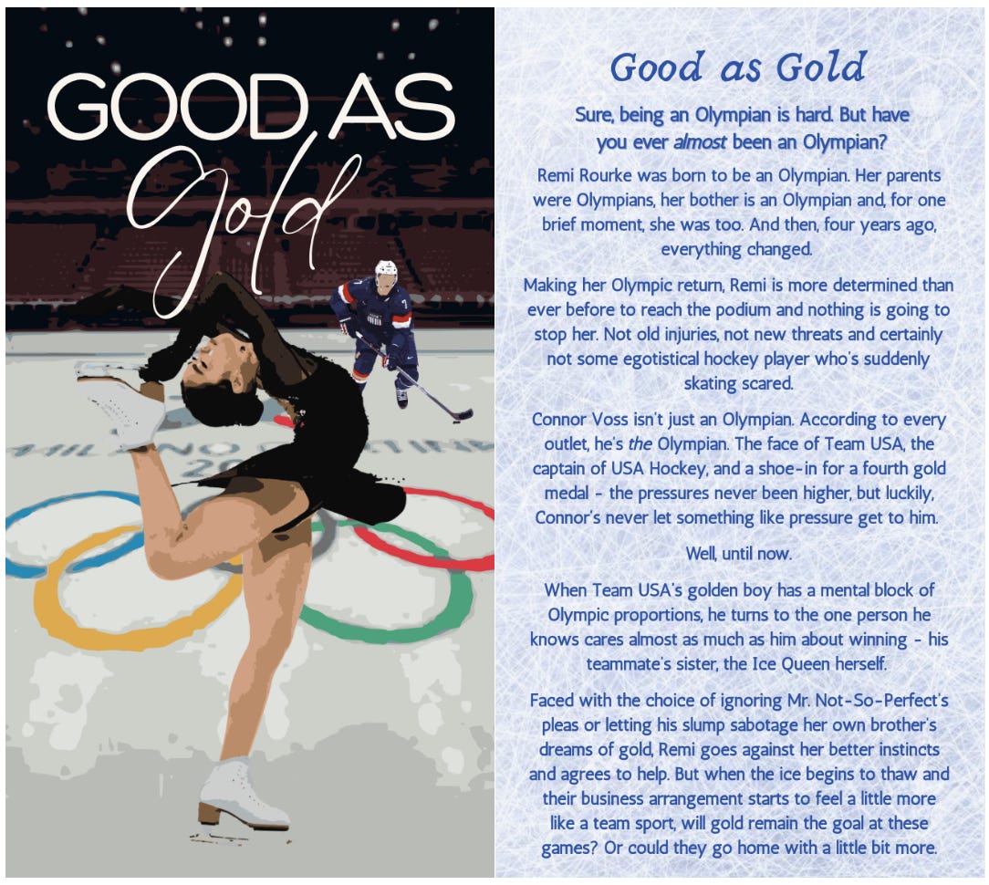 The vibes are simple this month—olympics, gold medals, and ice. In my mind, Remi has been fighting for gold her whole life (hence the girl sitting on the ice deep in thought in multiple shots) while Connor has had quite a different experience. He’s already a gold medal winner several times over while Remi is chasing hers!